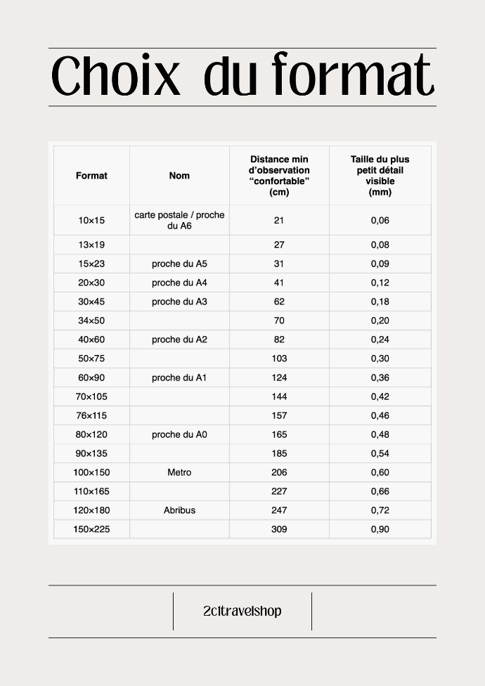 Prenons un exemple : tu aimerais l'accrocher dans ton salon. Dans cette pièce, ton canapé est situé à environ 2 mètres en face du mur où tu envisages de placer le tableau. C'est depuis ton canapé que tu auras la meilleure visibilité de l'œuvre. De plus, tu peux t'approcher au plus près à 20 cm pour en admirer les détails. En prenant ces mesures en compte, tu pourras choisir parmi une gamme de formats allant du 10x15 au 90x135.